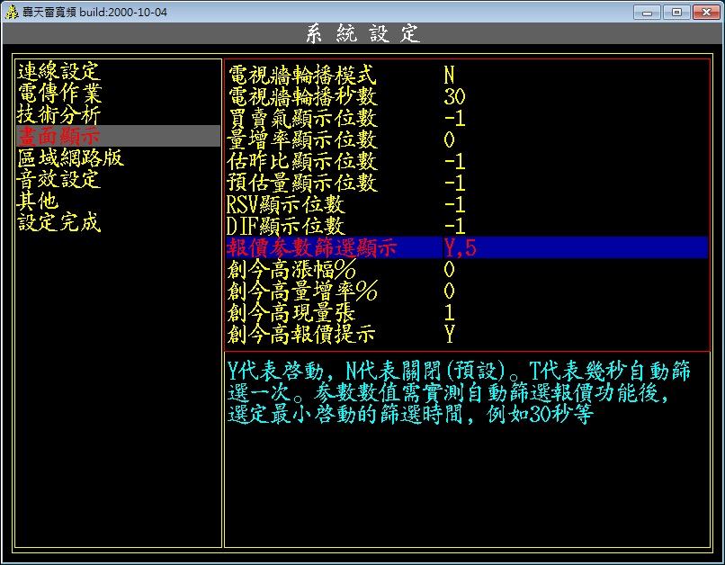 系統設定操作方式:【系統設定】?【畫面顯示】增加【報價參數篩選顯示】,其參數有兩個Y(開關)、T(秒數),畫面如下: