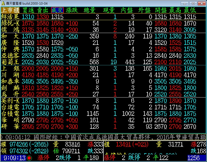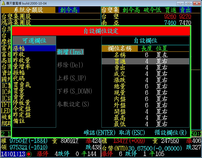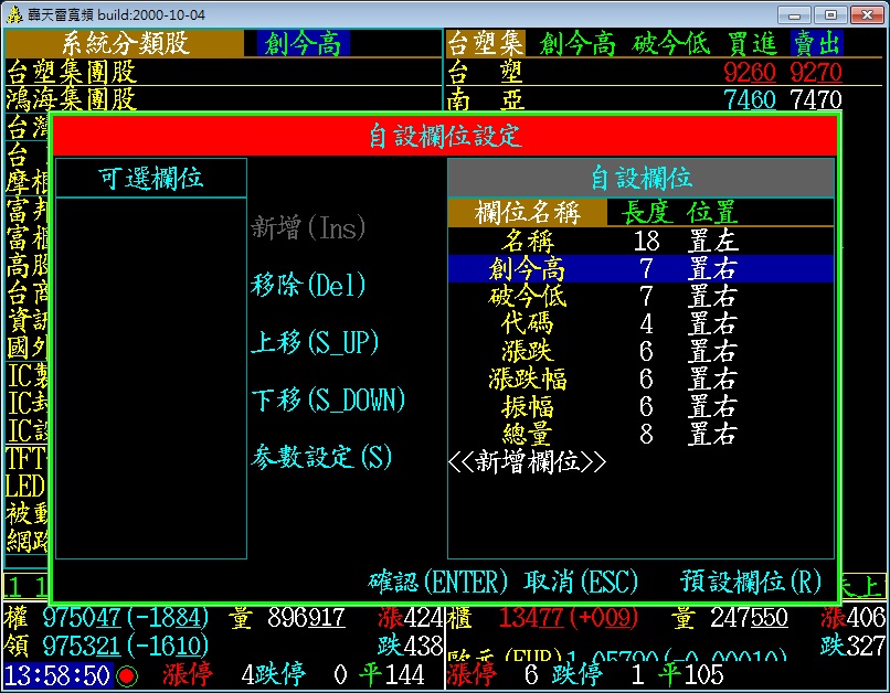 分類股漲跌幅(Ctrl+Q)報價畫面新增"創今高"、"破今低"欄位。