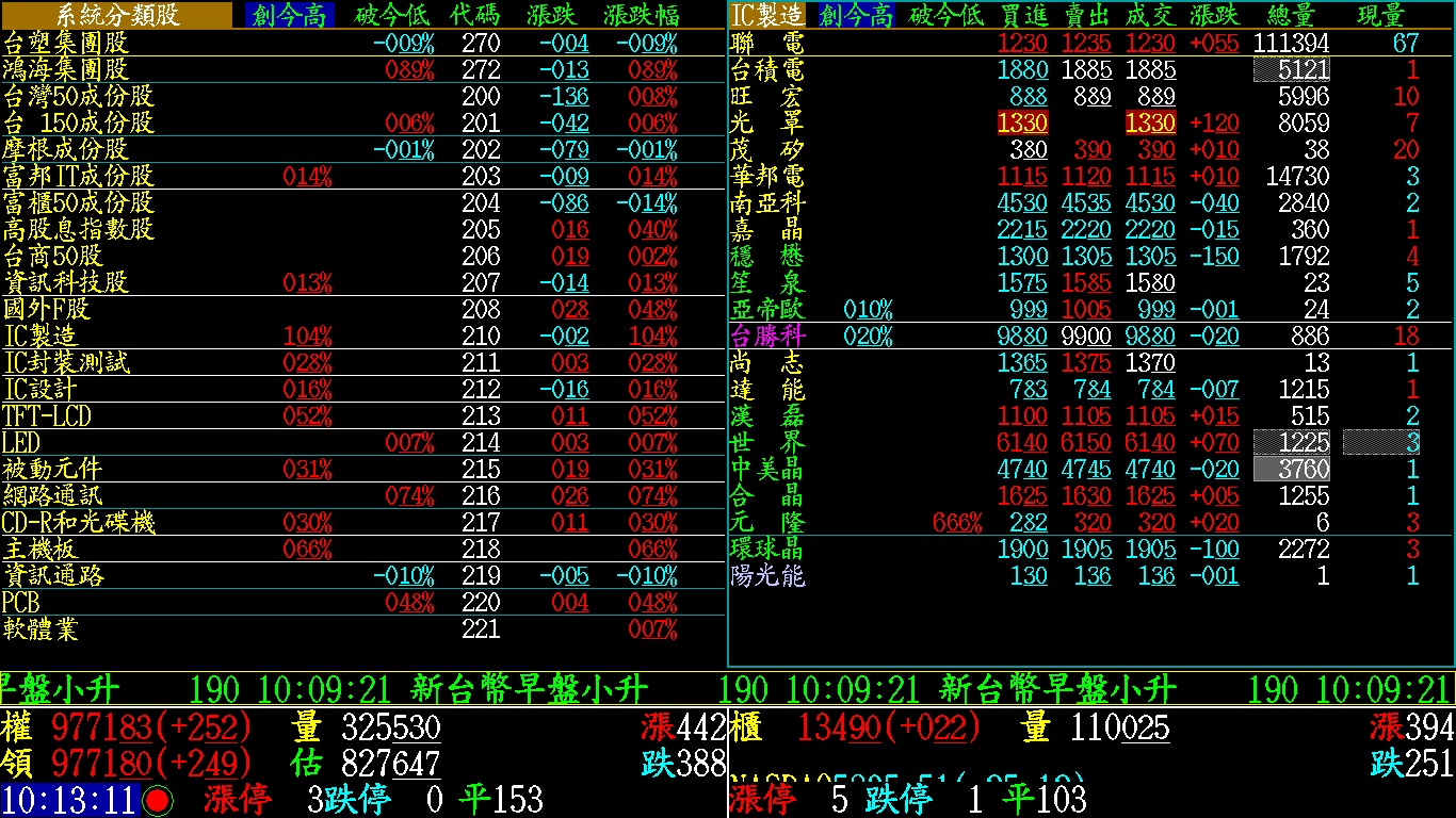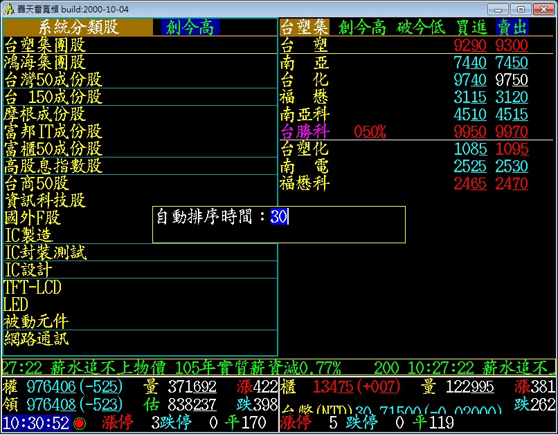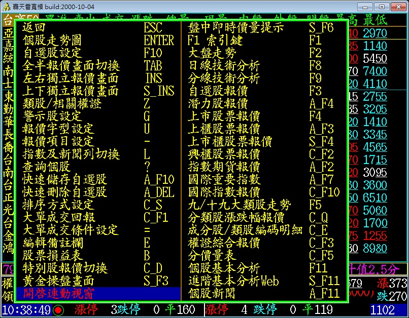 新增支援連動功能:超過兩個螢幕進入分類股漲跌幅報價(Ctrl+Q)時,其ㄧ畫面進入類股報價,另一系統分類股報價點選分類股時,類股報價畫面支援連動功能。
